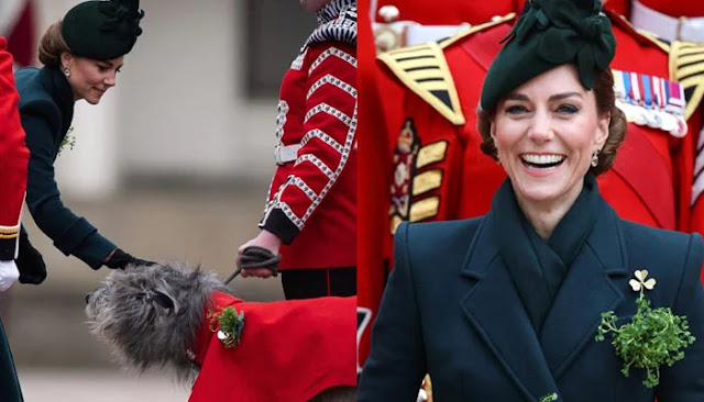Throughout the event, Catherine performed several ceremonial duties, reaffirming her commitment to her military patronage. She awarded long service and good conduct medals to soldiers within the regiment before presenting the traditional sprigs of shamrock to the Officers and Guardsmen.